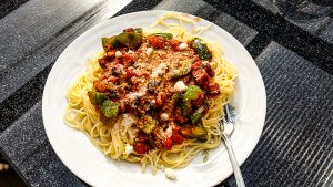 Nach dem Anrichten über das Ganze, den geriebenen Käse streuen.